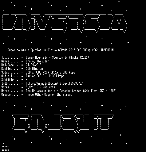 | FiLENAME: | Sugar.Mountain.Spurlos.in.Alaska.GERMAN.2016.AC3.BDRip.x264-UNiVERSUM.mkv |