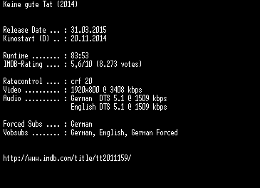 | FiLENAME: | Keine.gute.Tat.German.DL.1080p.BluRay.x264-EXQUiSiTE.mkv |