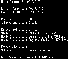 | FiLENAME: | Meine.Cousine.Rachel.2017.German.DTS.DL.1080p.BluRay.x264-COiNCiDENCE.mkv |