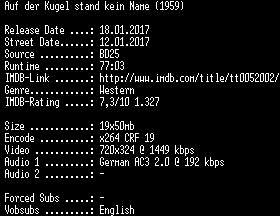 | FiLENAME: | Auf.der.Kugel.stand.kein.Name.German.REMASTERED.1959.AC3.BDRip.x264-SPiCY.mkv |
