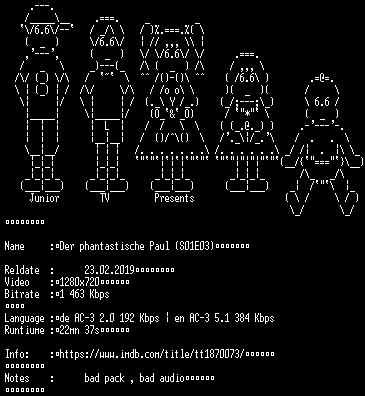 | FiLENAME: | Der.phantastische.Paul.S01E03.German.DL.720p.WEBHD.x264.PROPER-JuniorTV.mkv |