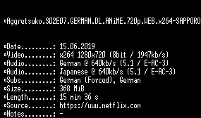 | FiLENAME: | Aggretsuko.S02E07.GERMAN.DL.ANiME.720p.WEB.x264-SAPPORO.mkv |