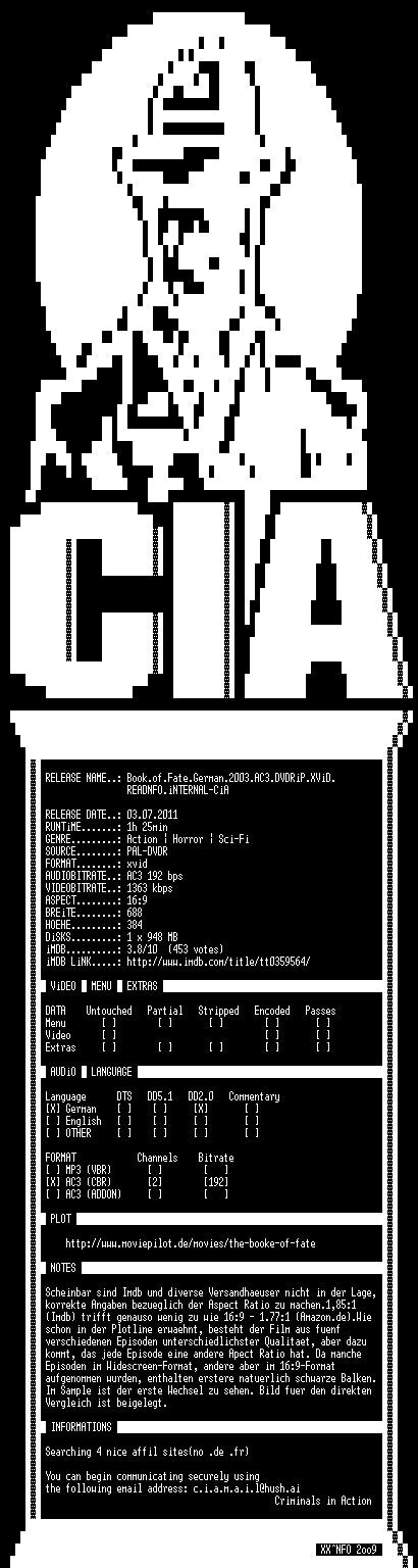 | FiLENAME: | Book.of.Fate.German.2003.AC3.DVDRiP.XViD.READNFO.iNTERNAL-CiA.avi |