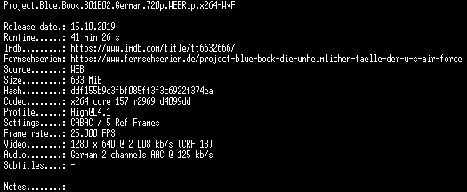 | FiLENAME: | Project.Blue.Book.S01E02.German.720p.WEBRip.x264-WvF.mkv |