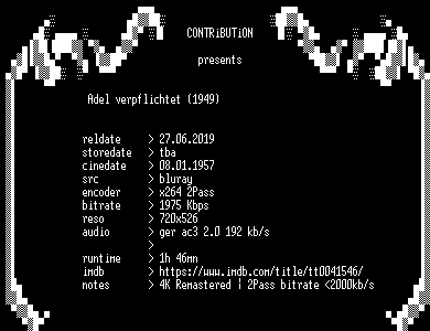 | FiLENAME: | Adel.verpflichtet.1949.Remastered.German.BDRip.x264-CONTRiBUTiON.mkv |
