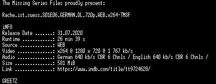 | FiLENAME: | Rache.ist.suess.S01E06.GERMAN.DL.720p.WEB.x264-TMSF.mkv |