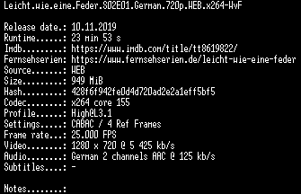 | FiLENAME: | Leicht.wie.eine.Feder.S02E01.German.720p.WEB.x264-WvF.mkv |