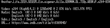 | FiLENAME: | Another.Life.2019.S01E05.Ein.eigener.Wille.GERMAN.DL.720p.WEBRiP.x264-OCA.mkv |