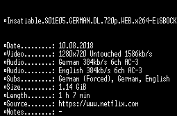 | FiLENAME: | Insatiable.S01E05.GERMAN.DL.720p.WEB.x264-EiSBOCK.mkv |