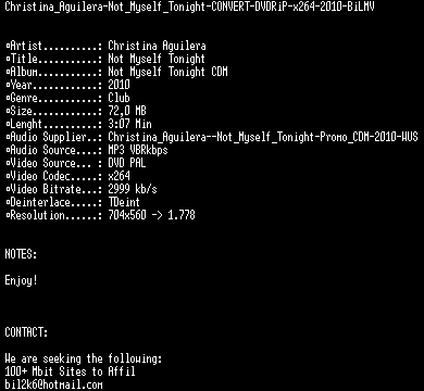 | FiLENAME: | Christina_Aguilera-Not_Myself_Tonight-CONVERT-DVDRiP-x264-2010-BiLMV.mkv |