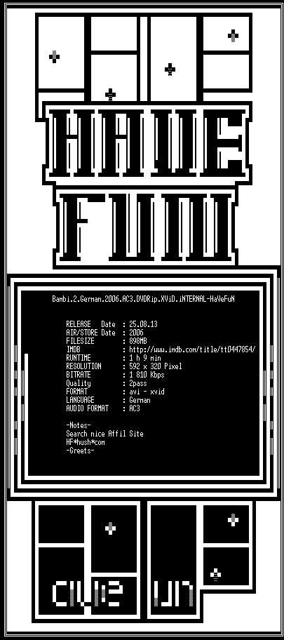 | FiLENAME: | Bambi.2.German.2006.AC3.DVDRip.XViD.iNTERNAL-HaVeFuN.avi |
