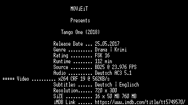 | FiLENAME: | Tango.One.German.2018.BDRiP.x264-MOViEiT.mkv |