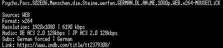 | FiLENAME: | Psycho.Pass.S02E06.Menschen.die.Steine.werfen.GERMAN.DL.ANiME.1080p.WEB.x264-MOUSECLiCK.mkv |