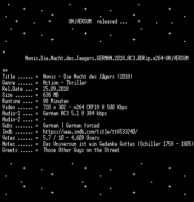 | FiLENAME: | Nomis.Die.Nacht.des.Jaegers.GERMAN.2018.AC3.BDRip.x264-UNiVERSUM.mkv |