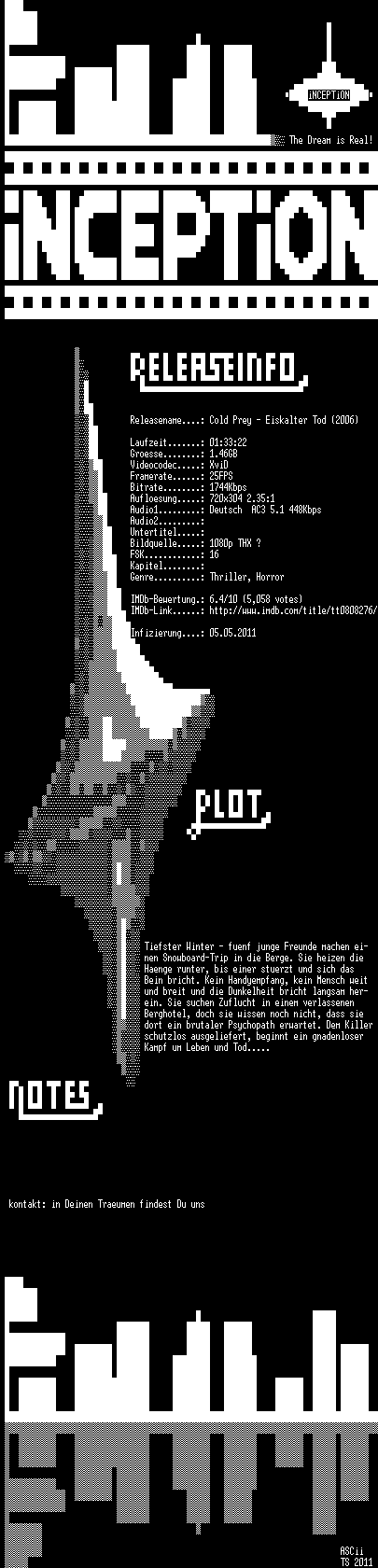 | FiLENAME: | Cold.Prey.Eiskalter.Tod.2006.German.AC3.HDRip.XviD-iNCEPTiON.avi |