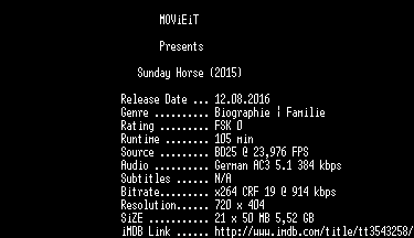 | FiLENAME: | Sunday.Horse.German.2015.AC3.BDRip.x264-MOViEiT.mkv |