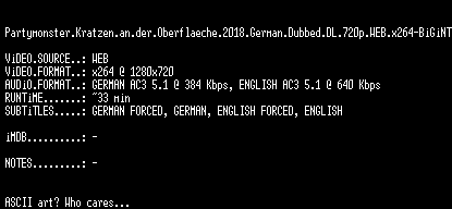 | FiLENAME: | Partymonster.Kratzen.an.der.Oberflaeche.2018.German.Dubbed.DL.720p.WEB.x264-BiGiNT.mkv |