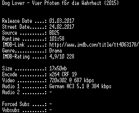 | FiLENAME: | Dog.Lover.Vier.Pfoten.fuer.die.Wahrheit.German.2016.AC3.BDRip.x264-SPiCY.mkv |