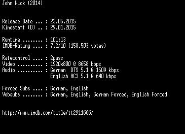 | FiLENAME: | John.Wick.2014.German.DL.1080p.BluRay.x264-EXQUiSiTE.mkv |