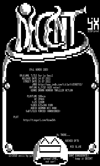 | FiLENAME: | Evil.Words.German.AC3.2003.DVDRip.XviD-DECENT.avi |