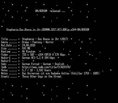 | FiLENAME: | Stephanie.Das.Boese.in.ihr.GERMAN.2017.AC3.BDRip.x264-UNiVERSUM.mkv |