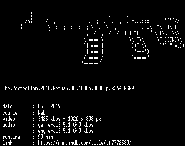 | FiLENAME: | The.Perfection.2018.German.DL.1080p.WEBRip.x264-GSG9.mkv |