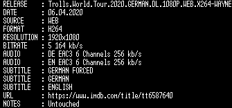 | FiLENAME: | Trolls.World.Tour.2020.GERMAN.DL.1080P.WEB.X264-WAYNE.mkv |