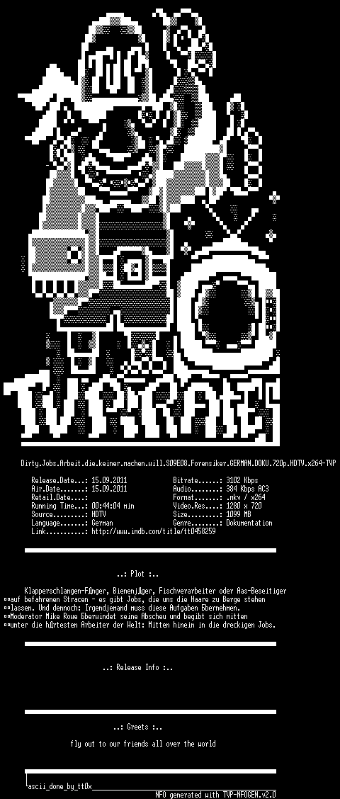 | FiLENAME: | Dirty.Jobs.Arbeit.die.keiner.machen.will.S09E08.Forensiker.GERMAN.DOKU.720p.HDTV.x264-TVP.mkv |