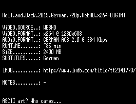 | FiLENAME: | Hell.and.Back.2015.German.720p.WebHD.x264-BiGiNT.mkv |