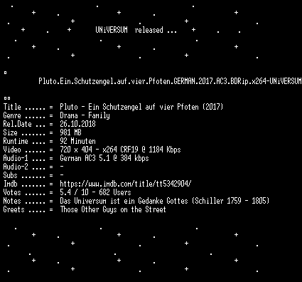 | FiLENAME: | Pluto.Ein.Schutzengel.auf.vier.Pfoten.GERMAN.2017.AC3.BDRip.x264-UNiVERSUM.mkv |