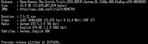 | FiLENAME: | Maze.Runner.The.Scorch.Trials.2015.RERIP.German.DL.2160p.UHD.BluRay.x265-BREAKERS.mkv |