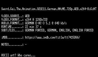 | FiLENAME: | Sword.Gai.The.Animation.S01E11.German.ANiME.720p.WEB.x264-BiGiNT.mkv |