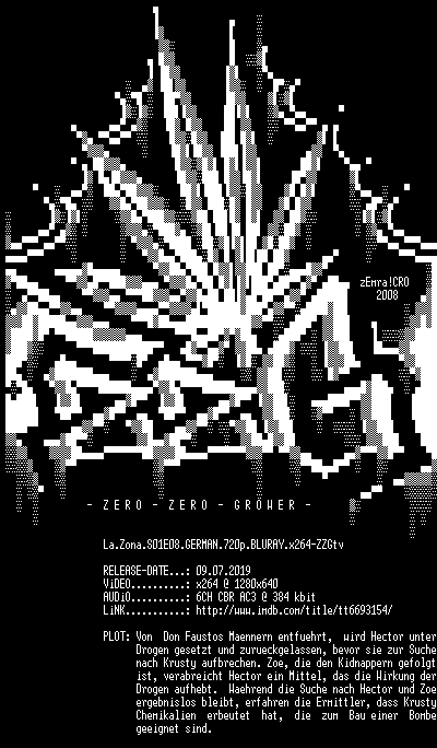 | FiLENAME: | La.Zona.S01E08.GERMAN.720p.BLURAY.x264-ZZGtv.mkv |