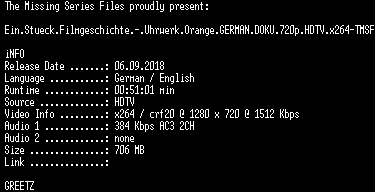 | FiLENAME: | Ein.Stueck.Filmgeschichte.-.Uhrwerk.Orange.GERMAN.DOKU.720p.HDTV.x264-TMSF.mkv |