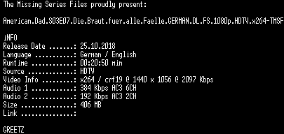 | FiLENAME: | American.Dad.S03E07.Die.Braut.fuer.alle.Faelle.GERMAN.DL.FS.1080p.HDTV.x264-TMSF.mkv |