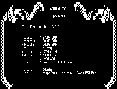 | FiLENAME: | Tschiller.Off.Duty.2016.German.1080p.BluRay.x264-CONTRiBUTiON.mkv |