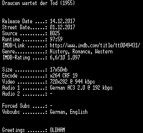 | FiLENAME: | Draussen.wartet.der.Tod.German.REMASTERED.1955.AC3.BDRip.x264-SPiCY.mkv |