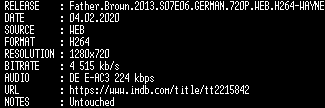 | FiLENAME: | Father.Brown.2013.S07E06.GERMAN.720P.WEB.H264-WAYNE.mkv |