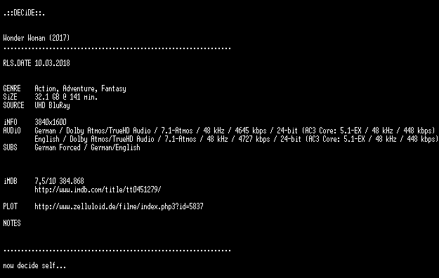 | FiLENAME: | Wonder.Woman.2017.GERMAN.DL.2160p.UHD.BluRay.x265-DECiDE.mkv |