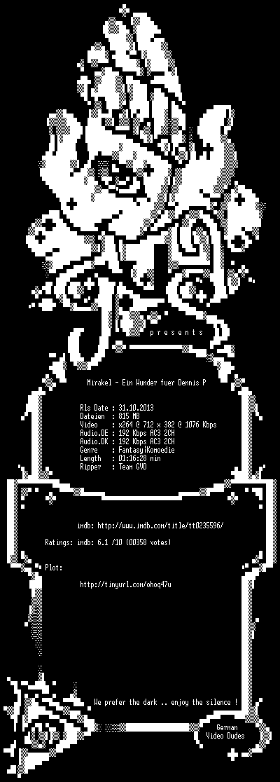 | FiLENAME: | Mirakel.Ein.Engel.fuer.Dennis.P.2000.German.DL.DVDRiP.x264-GVD.mkv |