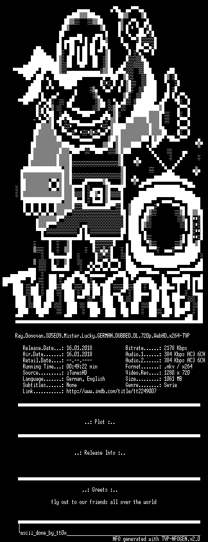 | FiLENAME: | Ray.Donovan.S05E09.Mister.Lucky.GERMAN.DUBBED.DL.720p.WebHD.x264-TVP.mkv |