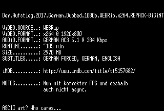 | FiLENAME: | Der.Aufstieg.2017.German.Dubbed.1080p.WEBRip.x264.REPACK-BiGiNT.mkv |