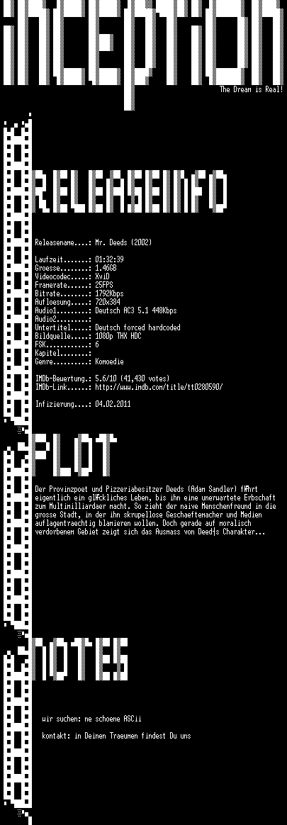 | FiLENAME: | Mr.Deeds.2002.German.AC3.HDRip.XviD-iNCEPTiON.avi |