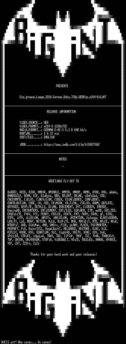 | FiLENAME: | Die.gruene.Luege.2018.German.Doku.720p.WEBRip.x264-BiGiNT.mkv |