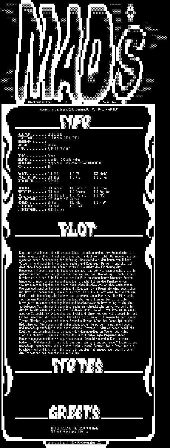 | FiLENAME: | 062.Requiem.for.a.Dream.2000.DC.German.DL.AC3.HDRip.XviD-MBC.CD1.avi |