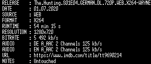 | FiLENAME: | The.Hunting.S01E04.GERMAN.DL.720P.WEB.X264-WAYNE.mkv |
