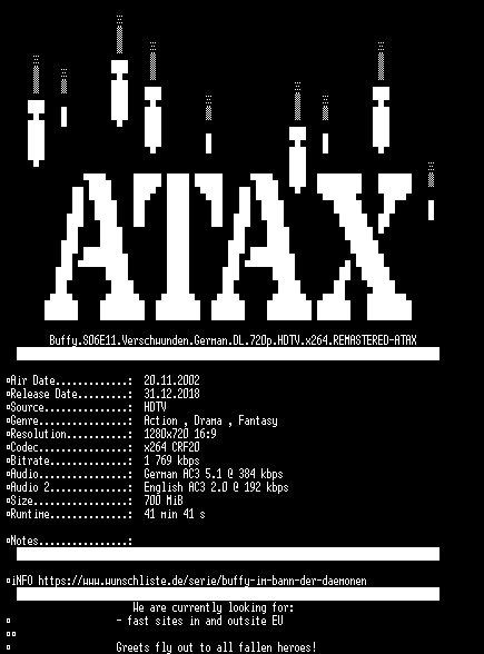 | FiLENAME: | Buffy.S06E11.Verschwunden.German.DL.720p.HDTV.x264.REMASTERED-ATAX.mkv |