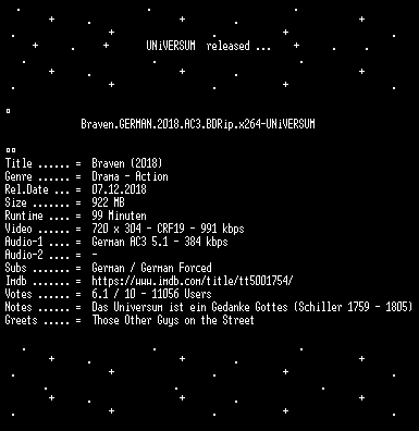 | FiLENAME: | Braven.GERMAN.2018.AC3.BDRip.x264-UNiVERSUM.mkv |
