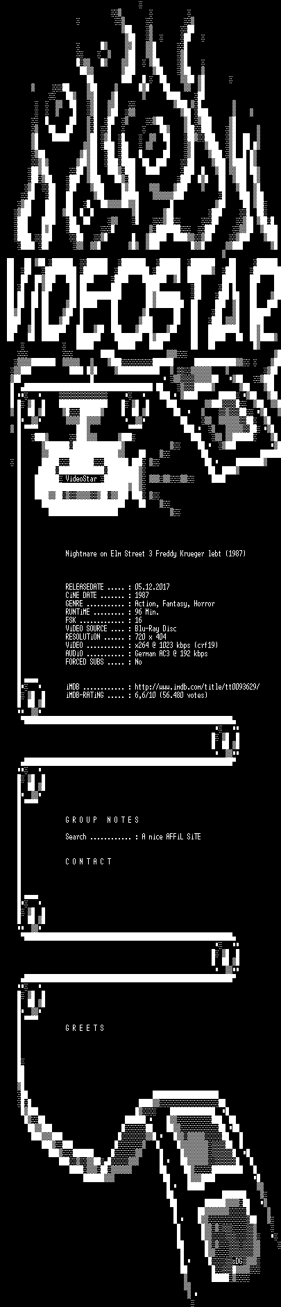 | FiLENAME: | Nightmare.on.Elm.Street.3.Freddy.Krueger.lebt.German.1987.AC3.BDRip.x264.iNTERNAL-VideoStar.mkv |