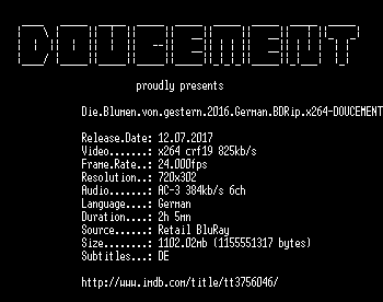 | FiLENAME: | Die.Blumen.von.gestern.2016.German.BDRip.x264-DOUCEMENT.mkv |
